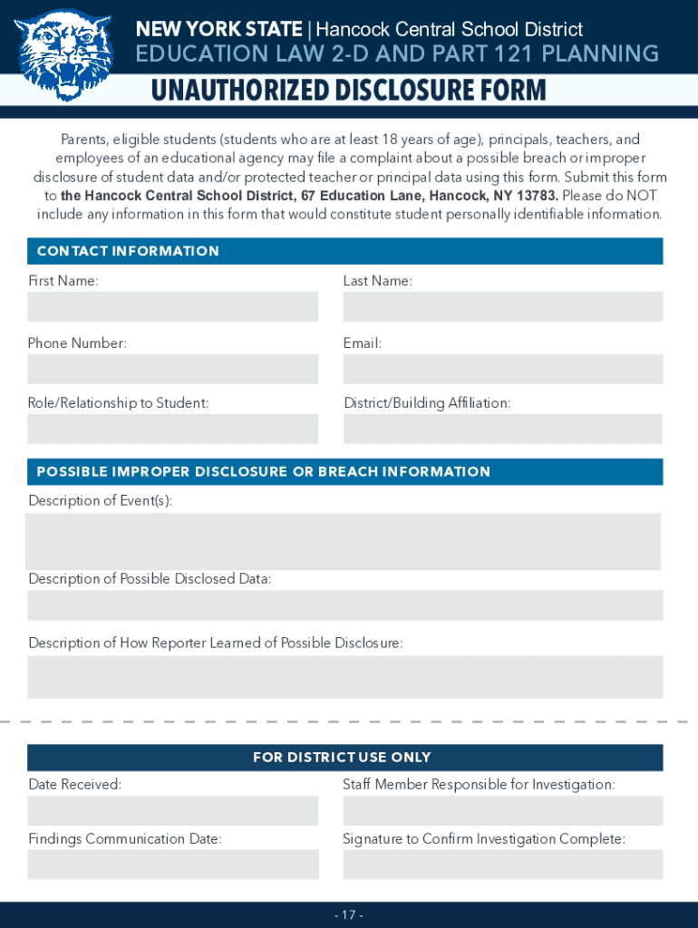 NEW YORK STATE | Hancock Central School DistrictEDUCATION LAW 2D AND PART 121 PLANNINGUNAUTHORIZED DISCLOSURE FORM Parents, eligible students (students who are at least 18 years of age), principals,