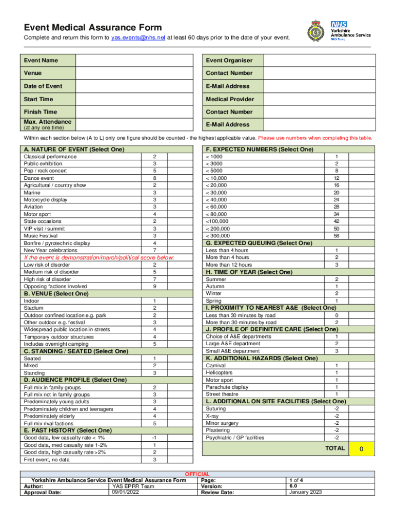 Event Medical Assurance Form Complete and return this form to yas.events@nhs.net at least 60 days prior to the date of your event. Event Nonevent OrganiserVenueContact Numerate of Eventual AddressStart