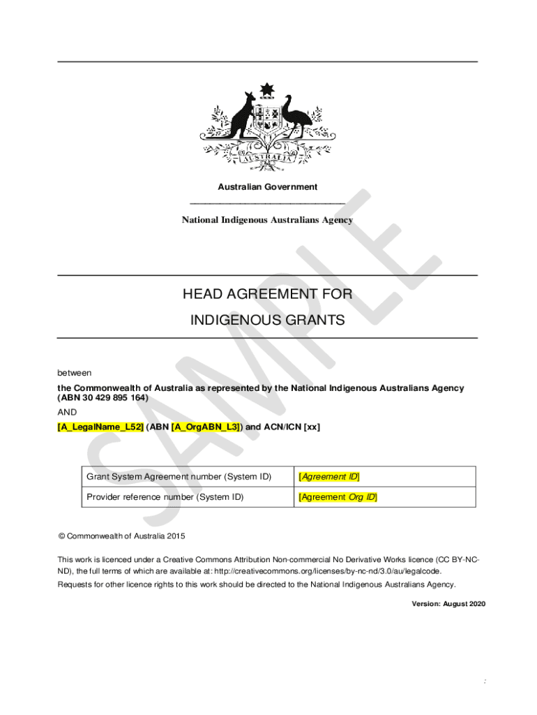 Logo of the non-Australian Government ___National Indigenous Australians AgencyHEAD AGREEMENT FOR INDIGENOUS GRANTS between the Commonwealth of Australia as represented by the National Indigenous