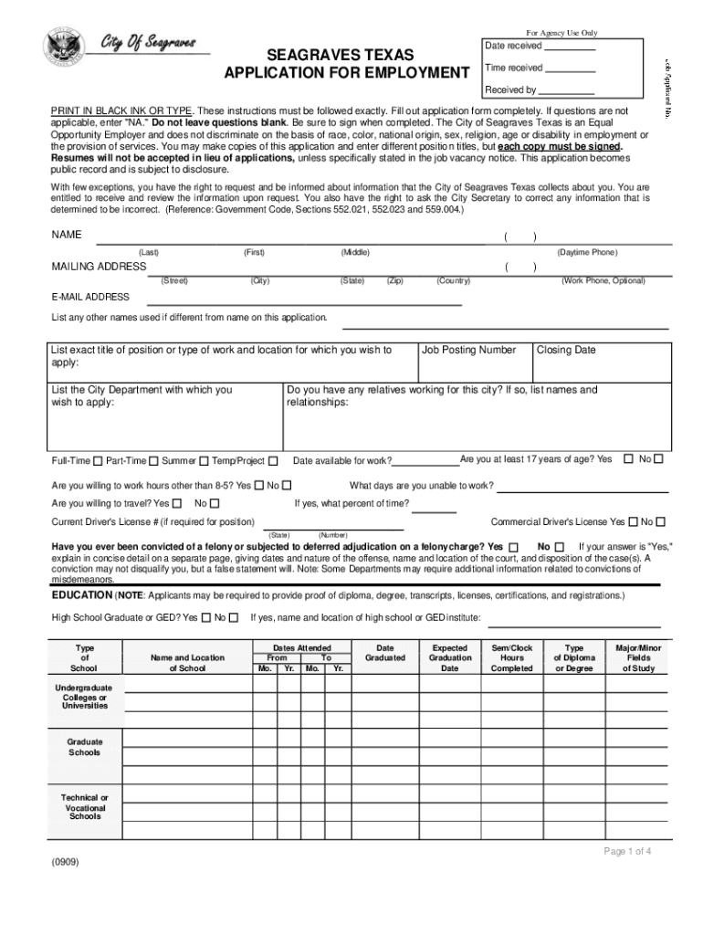 For Agency Use OnlySEAGRAVES TEXAS APPLICATION FOR EMPLOYMENTDate received Time received print IN BLACK INK OR TYPE. These instructions must be followed exactly. Fill out application form completely.
