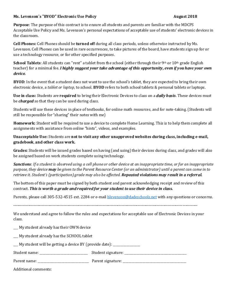 Ms. Levinson\'s \” BYOD\” Electronic Use Policy August 2018Purpose: The purpose of this contract is to ensure all students and parents are familiar with the MD CPS Acceptable Use Policy and Ms.