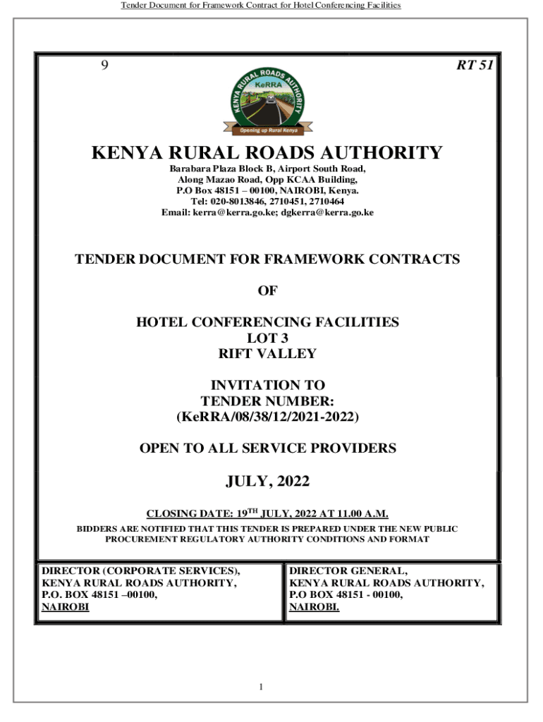 Tender Document for Framework Contract for Hotel Conferencing Facilities9RT 51KENYA RURAL ROADS AUTHORITY Barbara Plaza Block B, Airport South Road, Along Macao Road, Opp NCAA Building, P. O Box 48151