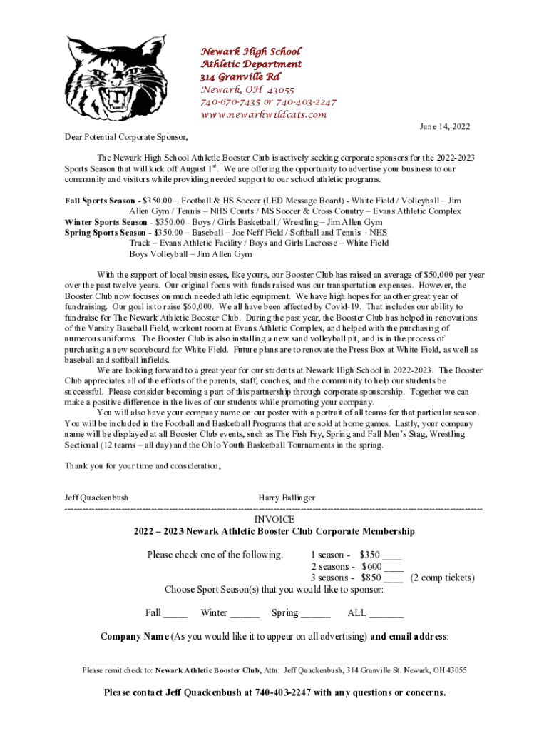 Newark High School Athletic Department 314 Granville Rd Newark, OH 43055 7406707435 or 7404032247 www.newarkwildcats.comJune 14, 2022 Dear Potential Corporate Sponsor, The Newark High School Athletic