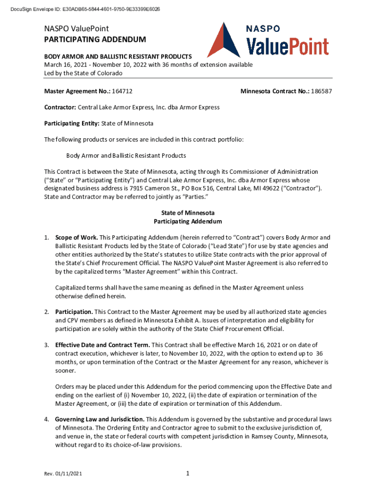 DocuSign Envelope ID: E30ADB655844460197509E33399E6026NASPO Bluepoint PARTICIPATING ADDENDUM BODY ARMOR AND BALLISTIC RESISTANT PRODUCTS March 16, 2021, November 10, 2022, with 36 months of extension