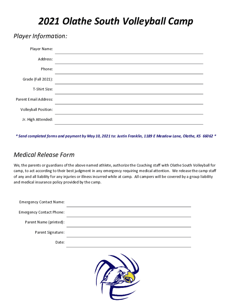 2021 Olathe South Volleyball Camp Player Information: Player Name: Address: Phone: Grade (Fall 2021): Shirt Size: Parent Email Address: Volleyball Position: Jr. High Attended:* Send completed forms