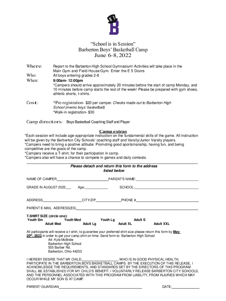 School is in Session Barberton Boys Basketball Camp June 68, 2022 Where: Who: When:Cost:Report to the Barberton High School Gymnasium! Activities will take place in the Main Gym and Field House Gym.