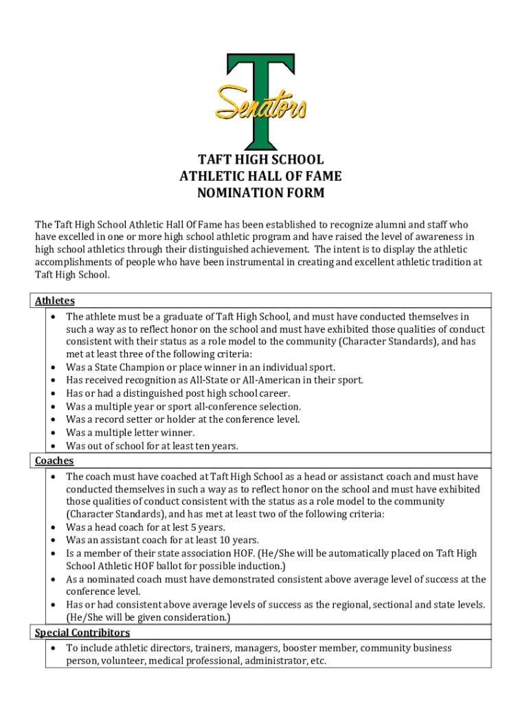 Get the free TAFT HIGH SCHOOL ATHLETIC HALL OF FAME NOMINATION FORM
