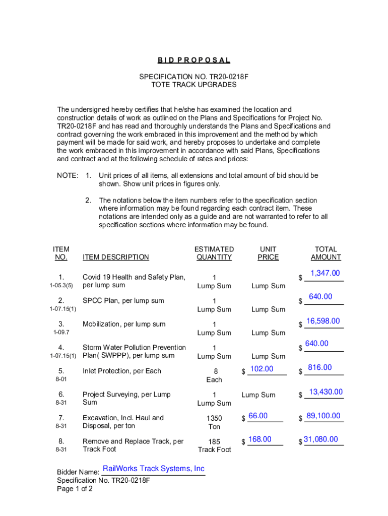 BID PROPOSAL SPECIFICATION NO. TR200218F TOTE TRACK UPGRADES The undersigned hereby certifies that he/she has examined the location and construction details of work as outlined on the Plans and Specifications