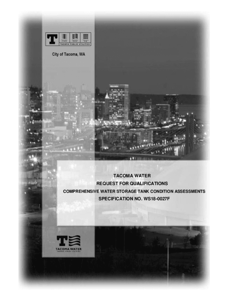 TACOMA WATER REQUEST FOR QUALIFICATIONS COMPREHENSIVE WATER STORAGE TANK CONDITION ASSESSMENTSSPECIFICATION NO. WS180027FCITY OF TACOMA DEPARTMENT OF PUBLIC UTILITIES TACOMA WATER January 2018 Engineering