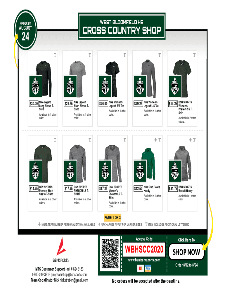 WEST BLOOMFIELD Orders BY CROSS-COUNTRY SHOPAUGUST$2430.00Nike Legend Long Sleeve Shirt Available in 1 other color.$26.75Nike Legend Short Sleeve Shirt Available in 1 other color.$26.00Nike Women\'s