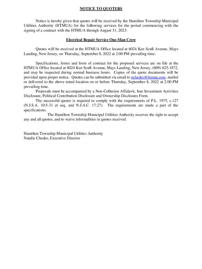 NOTICE TO Quote Notice is hereby given that quotes will be received by the Hamilton Township Municipal Utilities Authority (HTML) for the following services for the period commencing with the signing