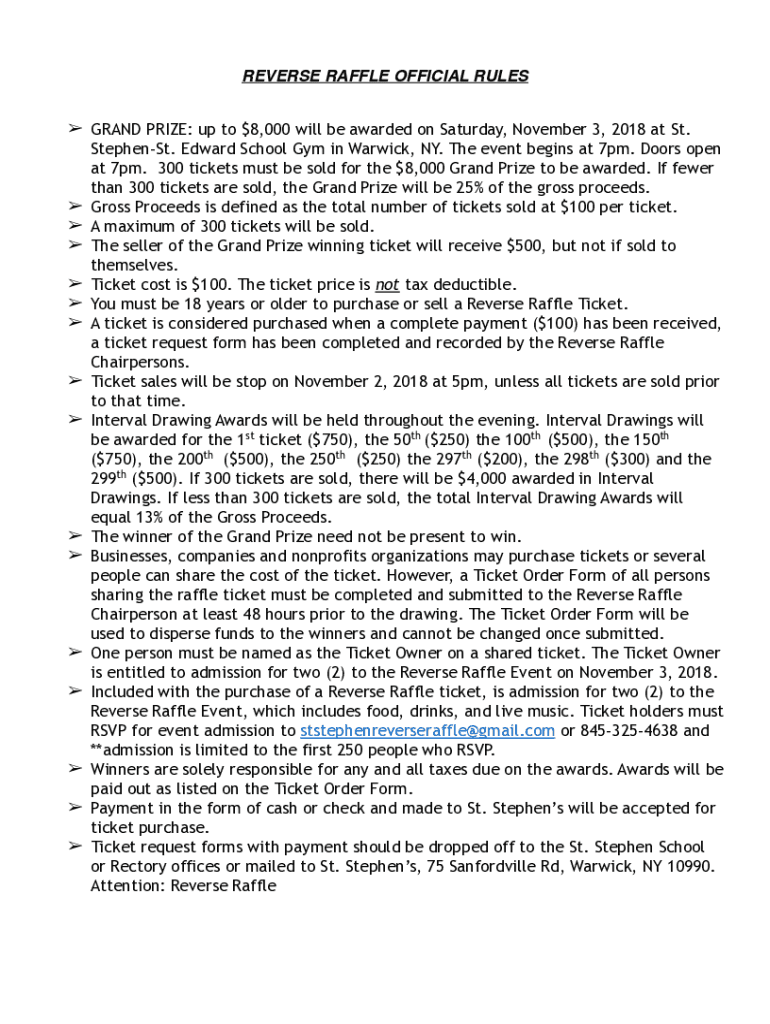 REVERSE RAFFLE OFFICIAL RULES GRAND PRIZE: up to $8,000 will be awarded on Saturday, November 3, 2018, at St. Stephens. Edward School Gym in Warwick, NY. The event begins at 7pm. Doors open at 7pm.