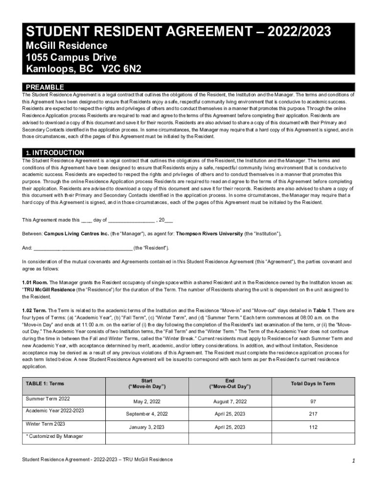 STUDENT RESIDENT AGREEMENT 2022/2023 McGill Residence 1055 Campus Drive Balloons, BC V2C 6N2 PREAMBLE The Student Residence Agreement is a legal contract that outlines the obligations of the Resident,