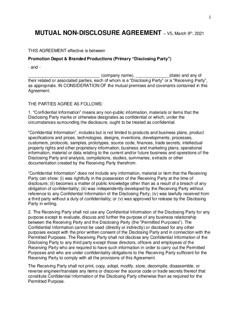 1MUTUAL NONDISCLOSURE AGREEMENT V5, March 9th, 2021 THIS AGREEMENT effective is between Promotion Depot & Branded Productions (Primary Disclosing Party) and ___ (company name), ___(date) and any of