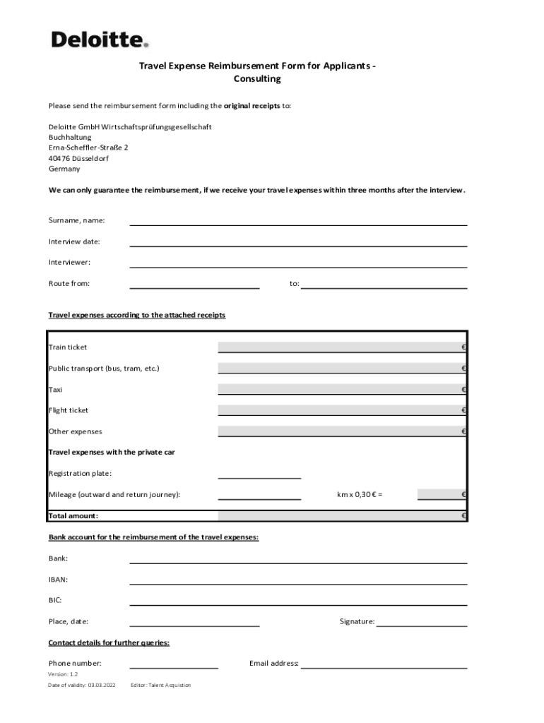 Travel Expense Reimbursement Form for Applicants Consulting Please send the reimbursement form including the original receipts to: Deloitte GmbH Wirtschaftsprfungsgesellschaft Buchhaltung ErnaSchefflerStrae
