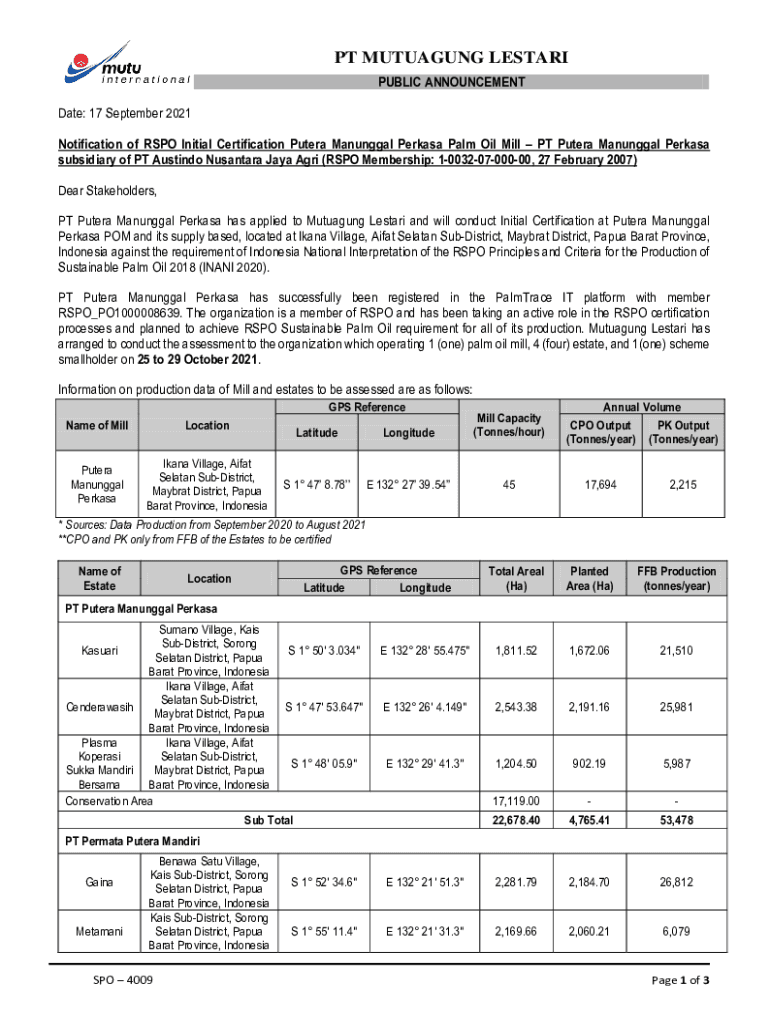Get the free Notification of RSPO Initial Certification of PT Putera ...