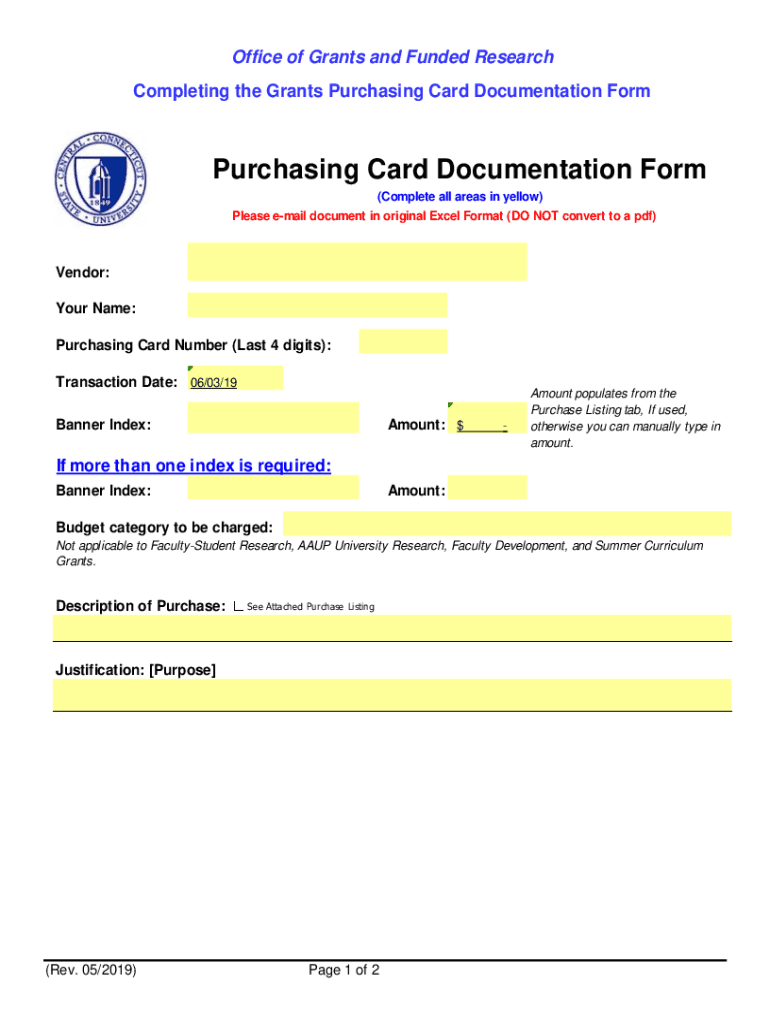 Office of Grants and Funded Research Completing the Grants Purchasing Card Documentation Repurchasing Card Documentation Form (Complete all areas in yellow) Please email document in original Excel