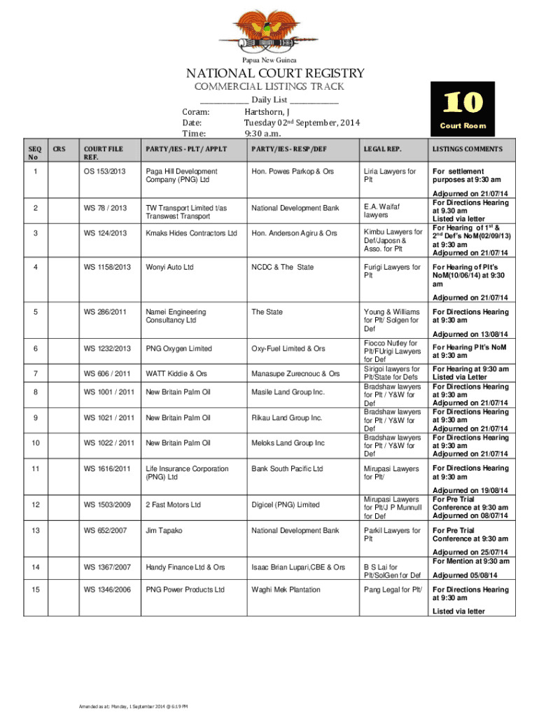 Papa New GuineaNATIONAL COURT REGISTRY COMMERCIAL LISTINGS TRACK ___ Daily List ___ Coral: Harts horn, J Date: Tuesday 02nd September 2014 Time: 9:30 a.m. SEQ No 1CRS10 Court Forecourt FILE REF.PARTY/IES