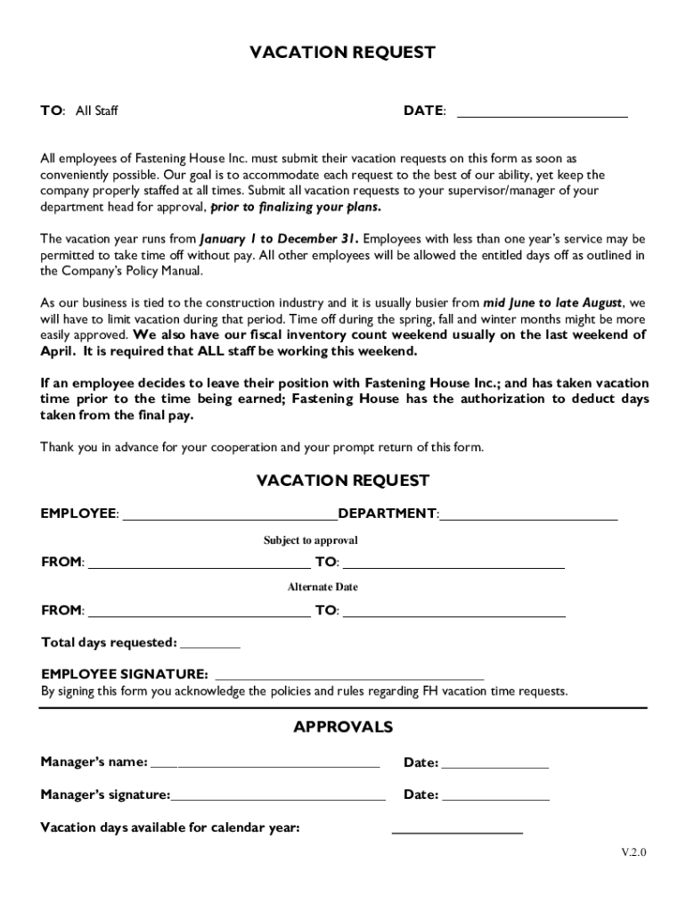 VACATION REQUEST TO: All Stalemate: ___All employees of Fastening House Inc. must submit their vacation requests on this form as soon as conveniently possible. Our goal is to accommodate each request