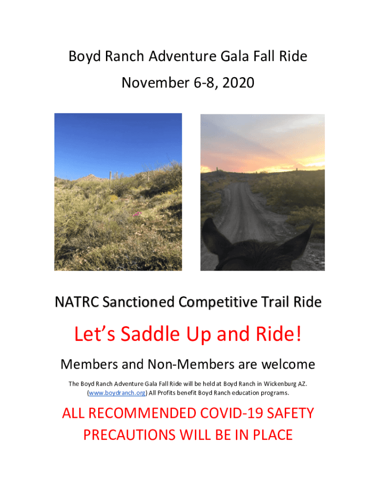 Boyd Ranch Adventure Gala Fall Ride November 68, 2020NATRC Sanctioned Competitive Trail Riddles Saddle Up and Ride! Members and Nonmembers are welcome The Boyd Ranch Adventure Gala Fall Ride will