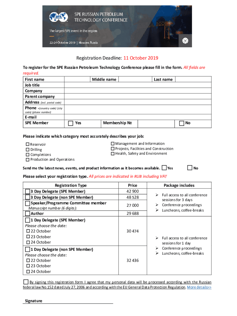 RegistrationDeadline:11October2019 ToregisterfortheSPERussianPetroleumTechnologyConferencepleasefillintheform. Allfieldsare required. First name Middle name Last name Job title Company Parent company