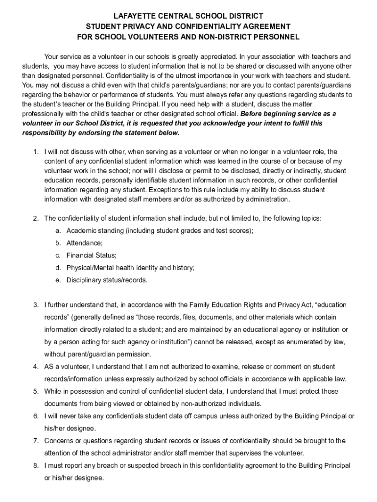 LAFAYETTE CENTRAL SCHOOL DISTRICT STUDENT PRIVACY AND CONFIDENTIALITY AGREEMENT FOR SCHOOL VOLUNTEERS AND DISTRICT PERSONNEL Your service as a volunteer in our schools is greatly appreciated. In your