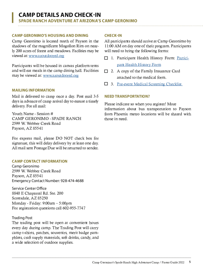 Grand Canyon Council BSA Council Service Center 8840 E Chaparral Rd Suite 200 Scottsdale, AZ 85250 (602) 9557747SPADE RACKSPACE RANCH HIGH ADVENTURE CAMP AT ARIZONA CAMP GERONIMO PARENT GuideStar