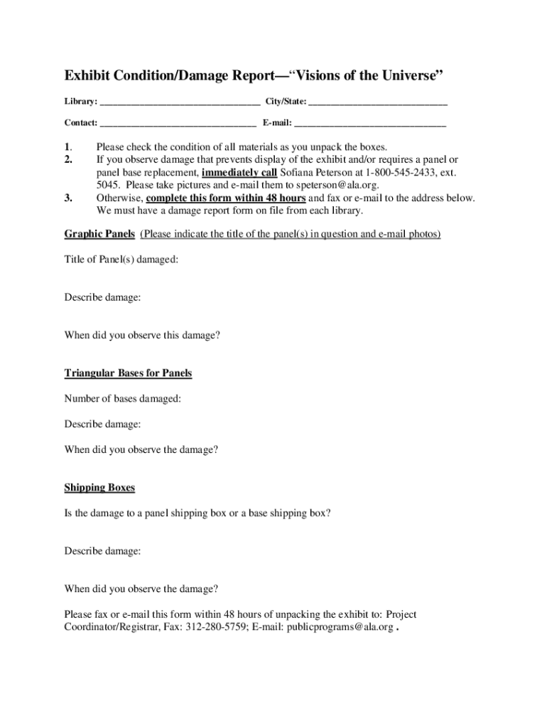 Exhibit Condition/Damage ReportVisions of the Universe Library: ___ City/State: ___ Contact: ___ Email: ___1. 2.3. Please check the condition of all materials as you unpack the boxes. If you observe