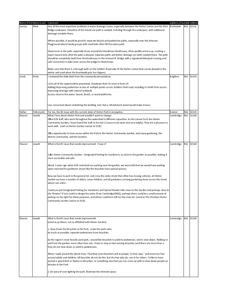 Name (First)Name (Last) Comment Address (CityAddreAddress (Zip) Jessica Mink One of the most important problems is water drainage issues, especially between the Heater Center and the Eliot Rosalinda