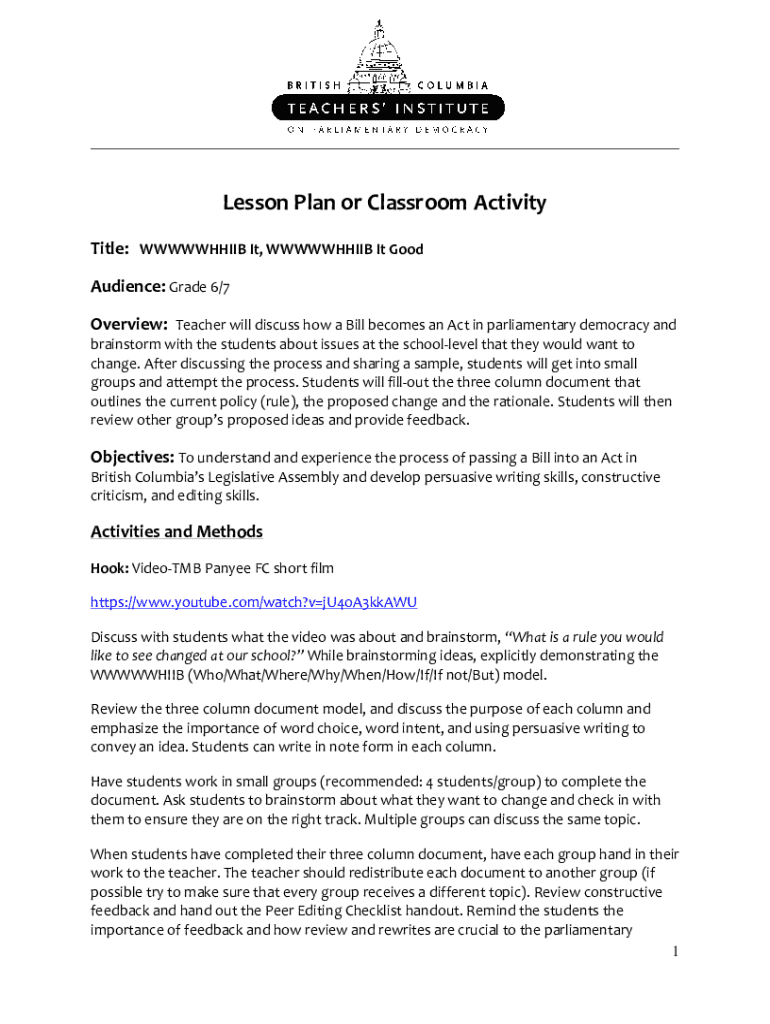___Lesson Plan or Classroom Activity Title: WWWWWHHIIB It, WWWWWHHIIB It Good Audience: Grade 6/7 Overview: Teacher will discuss how a Bill becomes an Act in parliamentary democracy and brainstorm