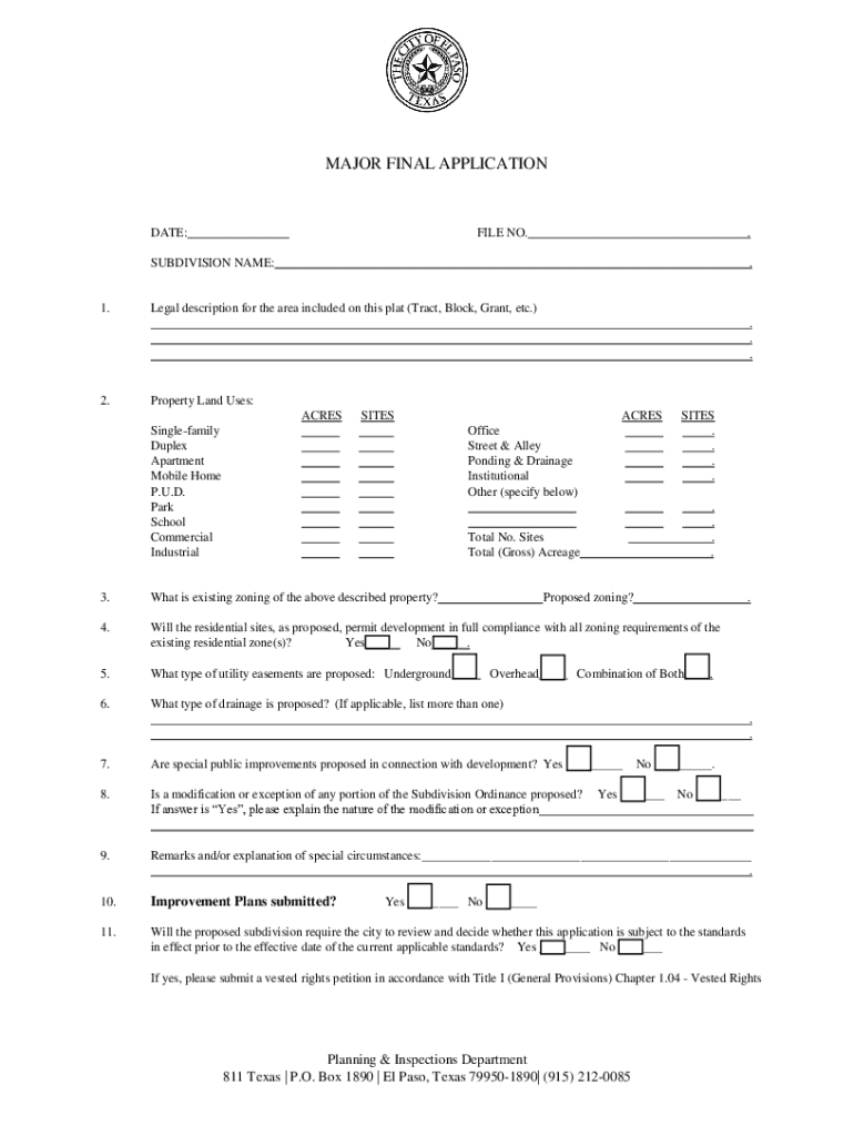 MAJOR FINAL APPLICATIONDATE:FILE NO.SUBDIVISION NAME:1. Legal description for the area included on this plat (Tract, Block, Grant, etc.) . . 2. Property Land Uses: ACRESSITESSinglefamily Duplex Apartment