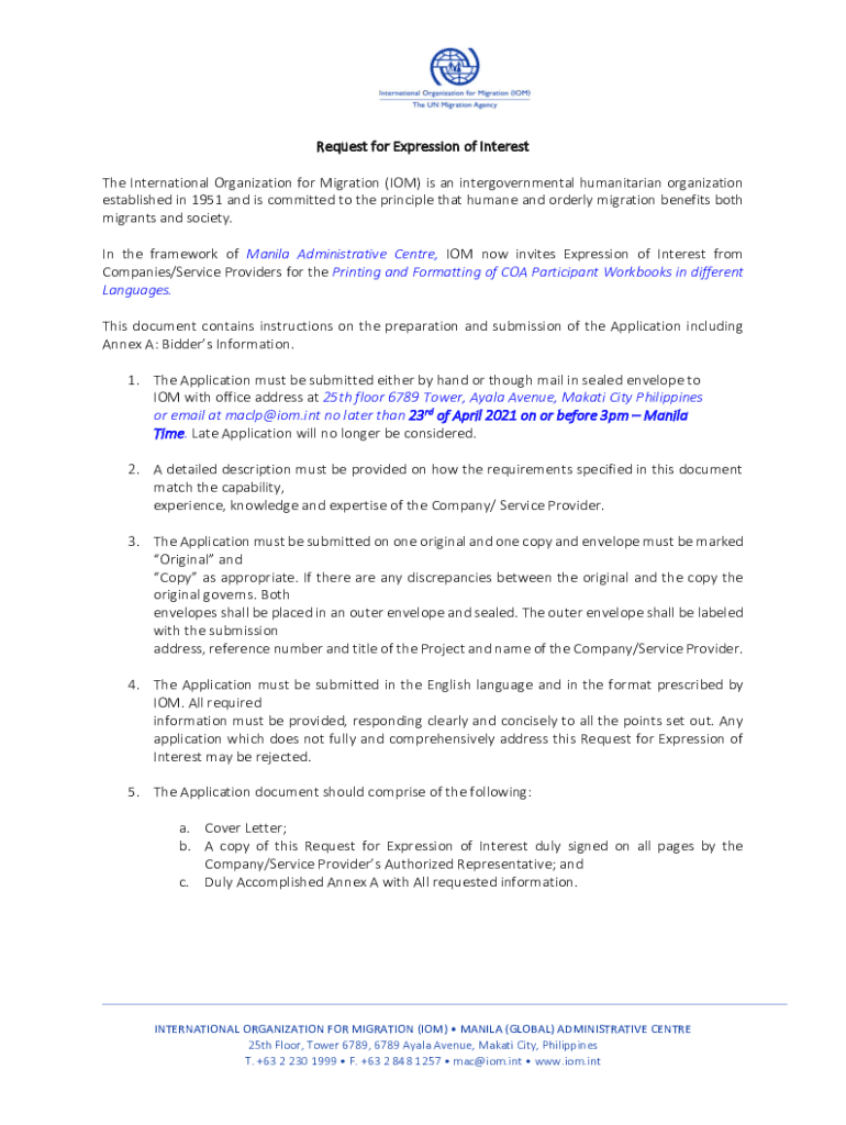 Request for Expression of Interest The International Organization for Migration (IOM) is an intergovernmental humanitarian organization established in 1951 and is committed to the principle that humane