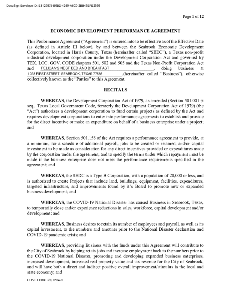 DocuSign Envelope ID: E1129875B6BD4249A5C02BB46EFE2666 F863D6E2EFC244FC82530A3F88A55427Page 1 of 12ECONOMIC DEVELOPMENT PERFORMANCE AGREEMENT This Performance Agreement (Agreement) is entered into