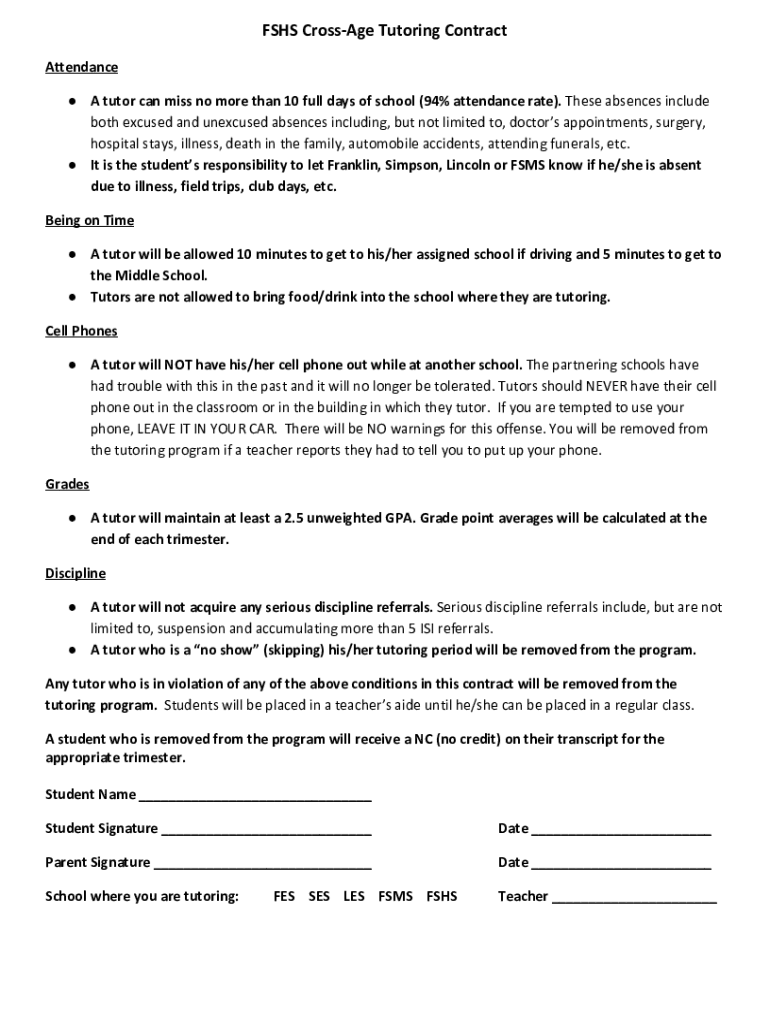 FSH Dressage Tutoring Contract Attendance A tutor can miss no more than 10 full days of school (94% attendance rate). These absences include both excused and unexcused absences including, but not