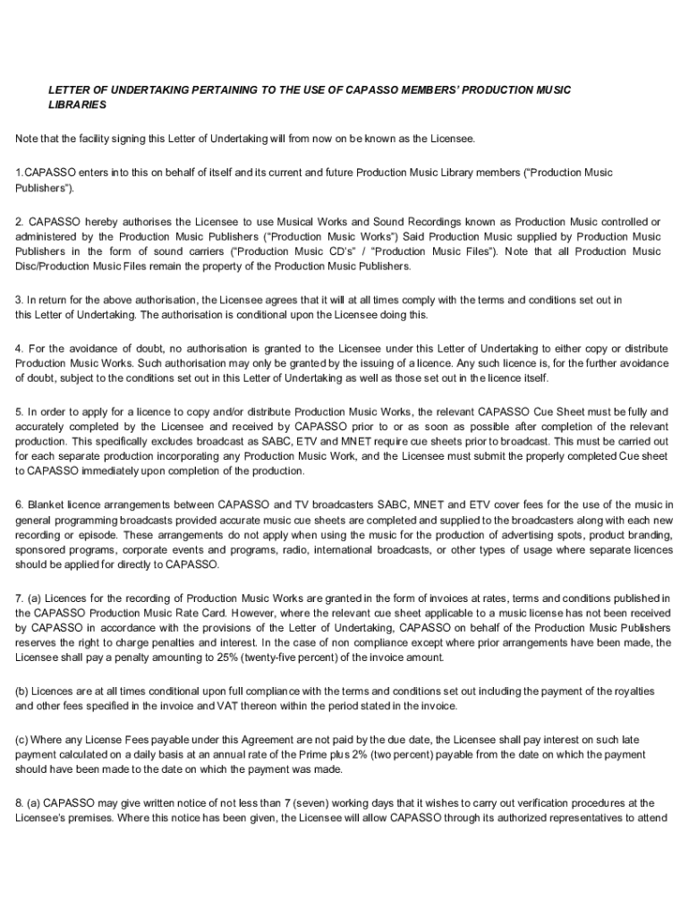 LETTER OF UNDERTAKING PERTAINING TO THE USE OF CAPASH MEMBERS PRODUCTION MUSIC LIBRARIES Note that the facility signing this Letter of Undertaking will from now on be known as the Licensee. 1.CAPASH