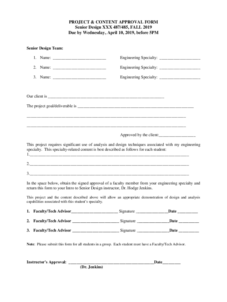 PROJECT & CONTENT APPROVAL FORM Senior Design XXX 487/485, FALL 2019 Due by Wednesday, April 10, 2019, before 5PMSenior Design Team: 1. Name: ___Engineering Specialty: ___2. Name: ___Engineering Specialty: