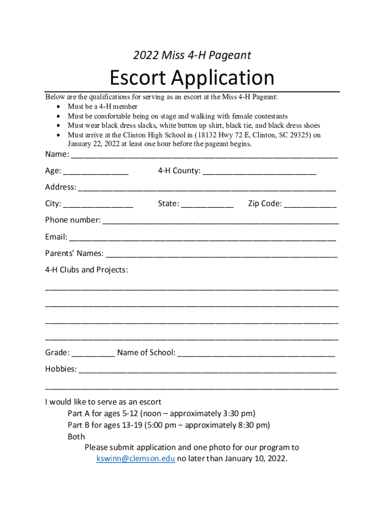 2022 Miss 4H PageantEscort Application Below are the qualifications for serving as an escort at the Miss 4H Pageant: Must be a 4H member Must be comfortable being on stage and walking with female