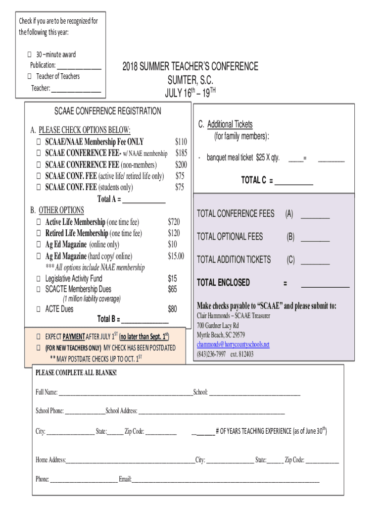Check if you are to be recognized for the following this year: 30 minute award Publication: ___ Teacher of Teachers Teacher: ___2018 SUMMER TEACHERS CONFERENCE SUMTER, S.C. JULY 16th 19THSCAAE CONFERENCE