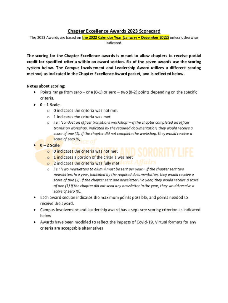 Chapter Excellence Awards 2023 Scorecard The 2023 Awards are based on the 2022 Calendar Year (January December 2022) unless otherwise indicated. The scoring for the Chapter Excellence awards is meant