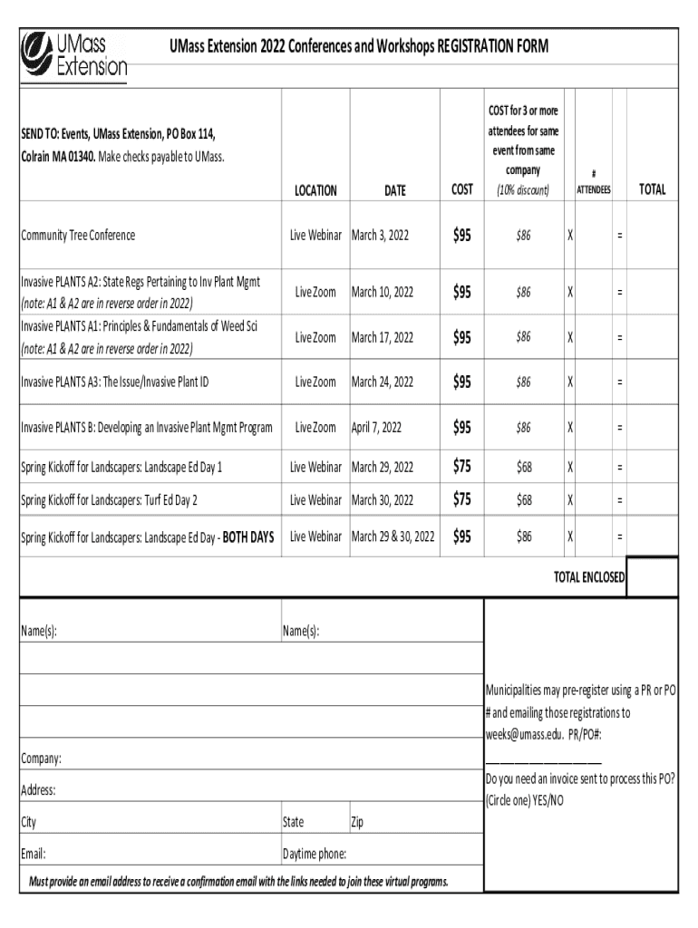 UMassExtension2022ConferencesandWorkshopsREGISTRATIONFORMDATECOSTCOSTfor3ormore attendeesforsame eventfromsame company (10%discount)LiveWebinar March$$3,20229586XSENDTO:Events, UMassExtension,POBox114,