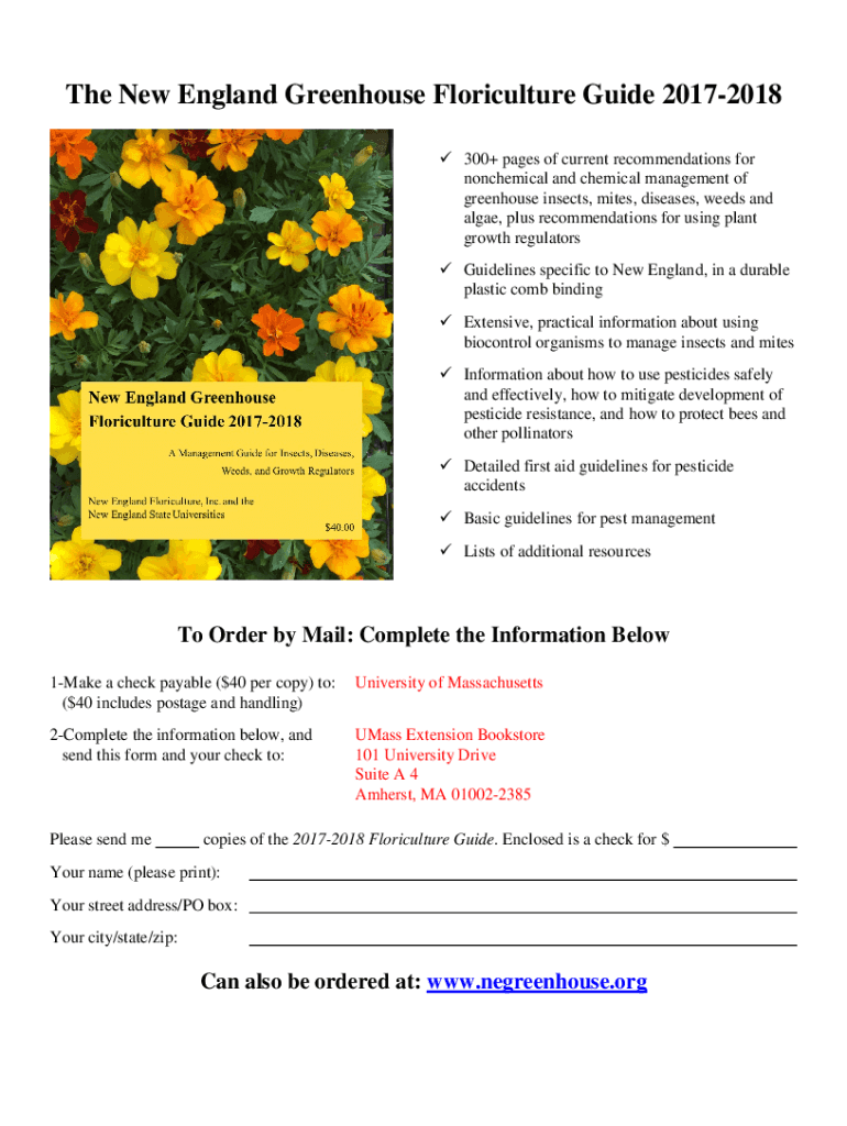 The New England Greenhouse Agriculture Guide 20172018 300+ pages of current recommendations for nonchemical and chemical management of greenhouse insects, mites, diseases, weeds and algae, plus recommendations