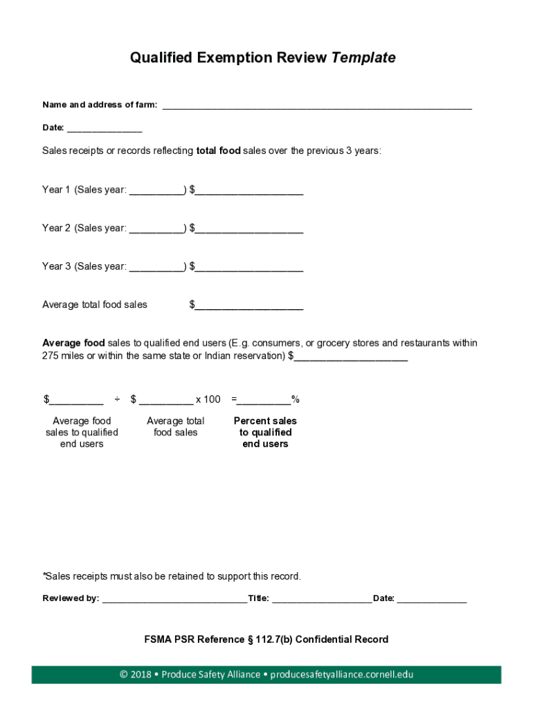 Qualified Exemption Review Template Name and address of farm: ___ Date: ___Sales receipts or records reflecting total food sales over the previous 3 years: Year 1 (Sales year: ___) $___ Year 2 (Sales