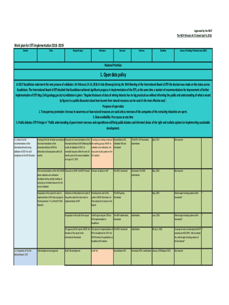 Approved by the NIP Minutes 72 dated April 9, 2018Work plan for EISTI implementation 2018 2019 ActionsTasksRequired stepsIndicatorsExecutorPartnersDeadlineSource of funding/ Estimated cost (USD)National