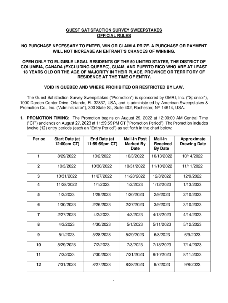 GUEST SATISFACTION SURVEY SWEEPSTAKES OFFICIAL RULES NO PURCHASE NECESSARY TO ENTER, WIN OR CLAIM A PRIZE. A PURCHASE OR PAYMENT WILL NOT INCREASE AN ENTRANTS CHANCES OF WINNING. OPEN ONLY TO ELIGIBLE