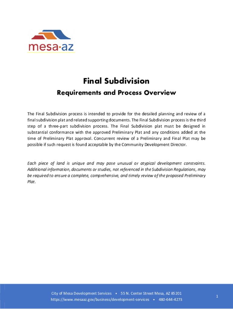 Final Subdivision Requirements and Process Overview The Final Subdivision process is intended to provide for the detailed planning and review of a final subdivision plat and related supporting documents.