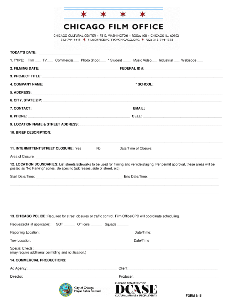 TODAYS DATE: ___ 1. TYPE:Film ___ TV___ Commercial___ Photo Shoot___ * Student___ Music Video___ Industrial ___ Webisode ___2. FILMING DATE: ___ FEDERAL ID #: ___ 3. PROJECT TITLE: ___ 4. COMPANY