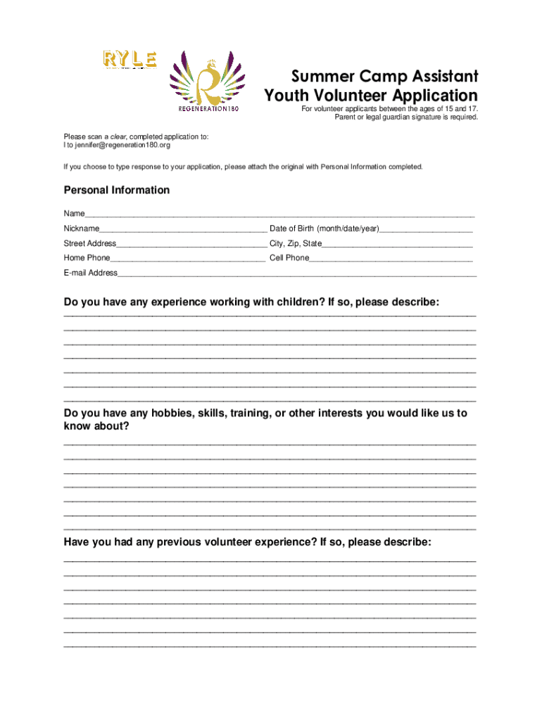 Summer Camp Assistant Youth Volunteer Application For volunteer applicants between the ages of 15 and 17. Parent or legal guardian signature is required. Please scan a clear, completed application
