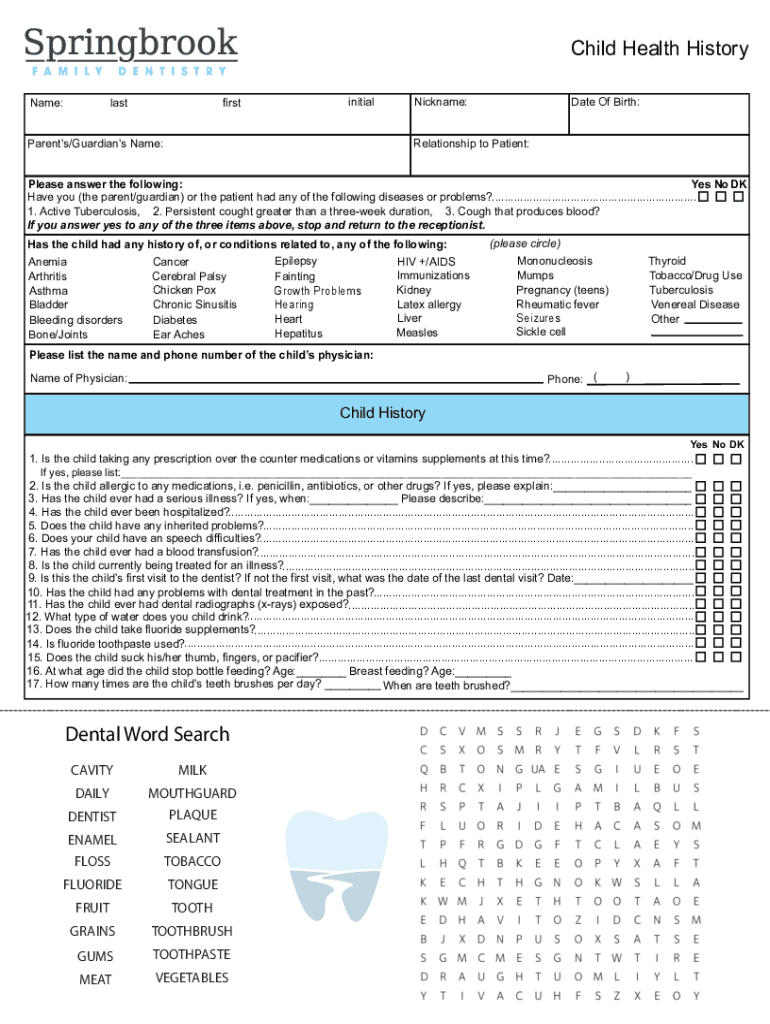The form can be filled out by providing accurate information about the child's dental health history, including previous treatments, medications, and any current issues.