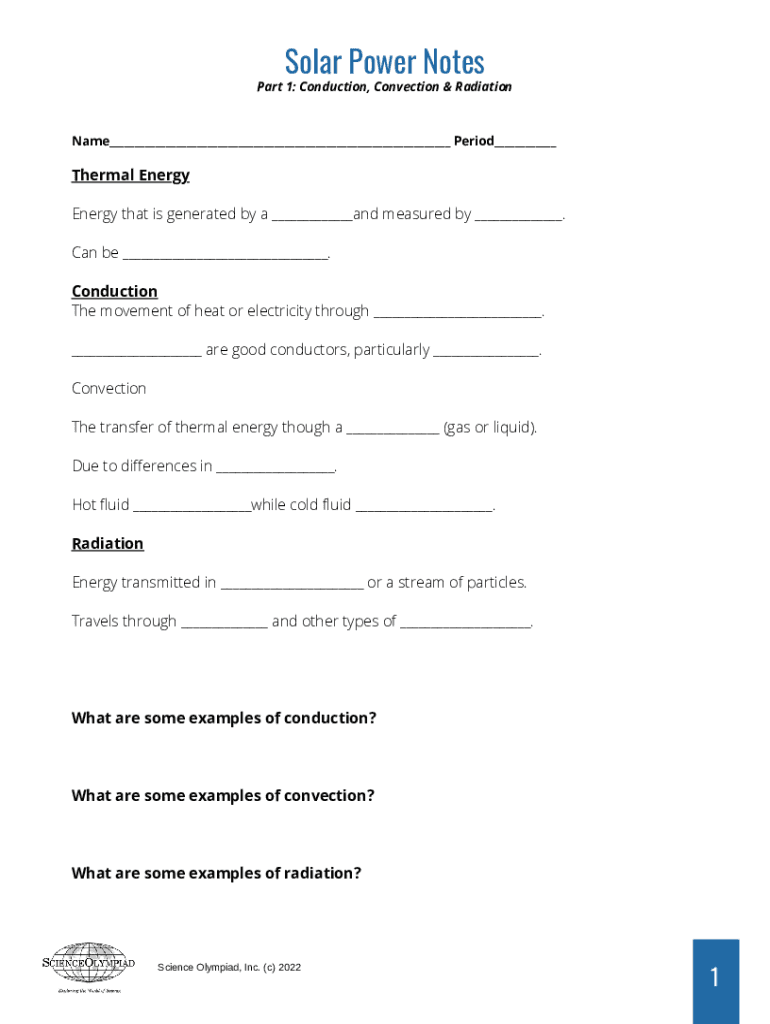 Solar Power Forepart 1: Conduction, Convection & RadiationName___ Period___Thermal Energy that is generated by a ___and measured by ___. Can be ___. Conduction The movement of heat or electricity