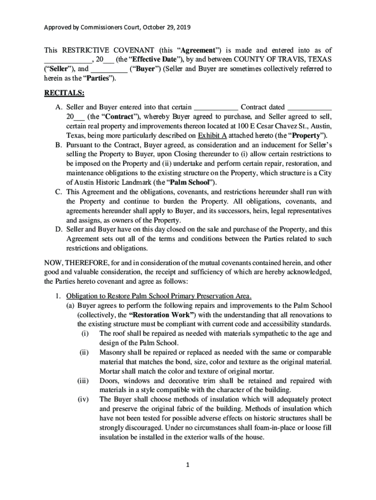 Approved by Commissioners Court, October 29, 2019This RESTRICTIVE COVENANT (this Agreement) is made and entered into as of ___, 20___ (the Effective Date), by and between COUNTY OF TRAVIS, TEXAS (Seller),